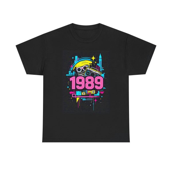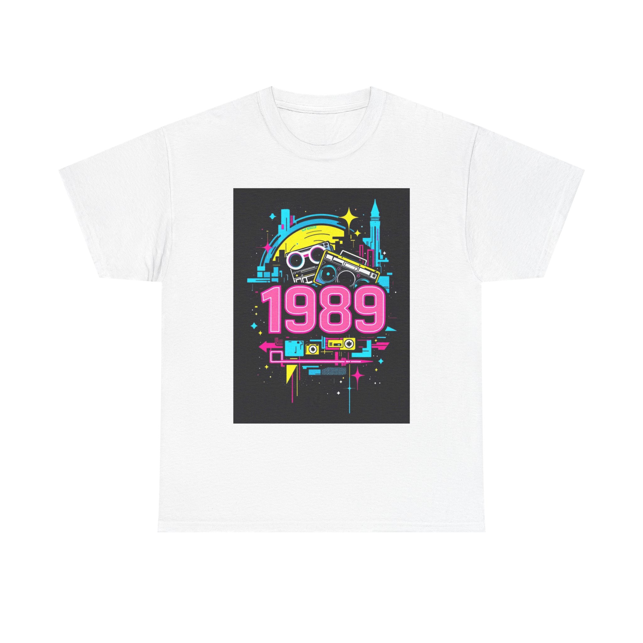 This vibrant retro-style image celebrates the year 1989 with a colorful neon aesthetic reminiscent of 80s pop culture. The design features iconic elements like a boombox and cassette tapes, set against a stylized cityscape with skyscrapers and twinkling stars. Bold pink numbers spelling out “1989” dominate the center, surrounded by geometric shapes and electronic components…