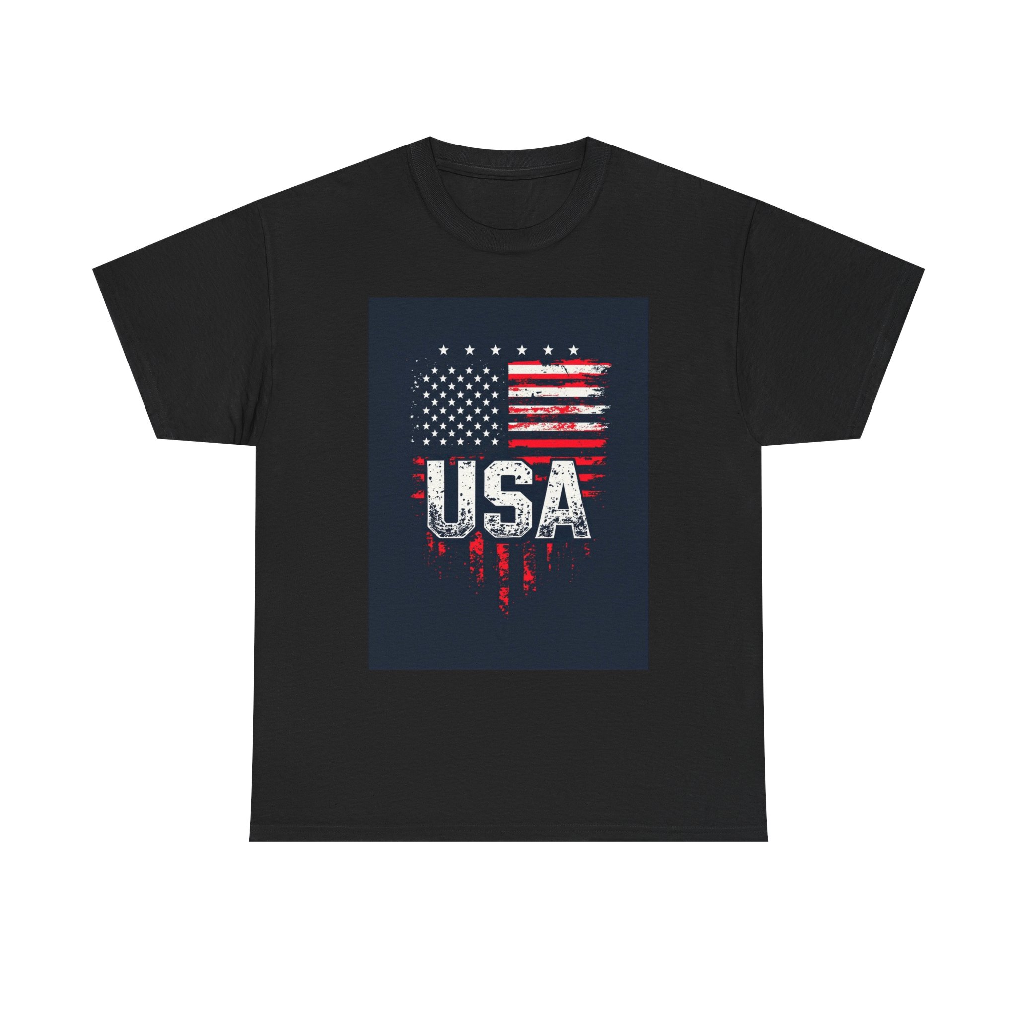This striking image features a patriotic design of the American flag with a distressed, grunge-style aesthetic. The upper portion displays the iconic stars and stripes in white and red against a dark navy background. Below the flag, the letters “USA” are prominently displayed in large, bold white text with a weathered appearance. The overall design…