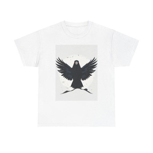 This striking image features a powerful black raven with its wings spread wide against a textured white background. The bird’s intense red eyes and sharp beak give it a fierce, almost supernatural appearance. Its feathers are intricately detailed, showcasing the raven’s majestic form as it seems to soar towards the viewer. The contrast between the dark plumage and the light backdrop creates a dramatic visual effect, emphasizing the bird’s silhouette. Positioned centrally, the raven dominates the composition, symbolizing strength, mystery, and intelligence. The circular white background, speckled with subtle gray marks, resembles a full moon, adding to the mystical atmosphere of the artwork. At the bottom of the image, a simple landscape suggestion grounds the flying raven. This minimalist yet impactful design would be ideal for various applications, from tattoo art to graphic design projects. The image captures the essence of the raven as a creature of folklore and legend, making it a compelling visual representation for those interested in mythology, nature, or gothic aesthetics.