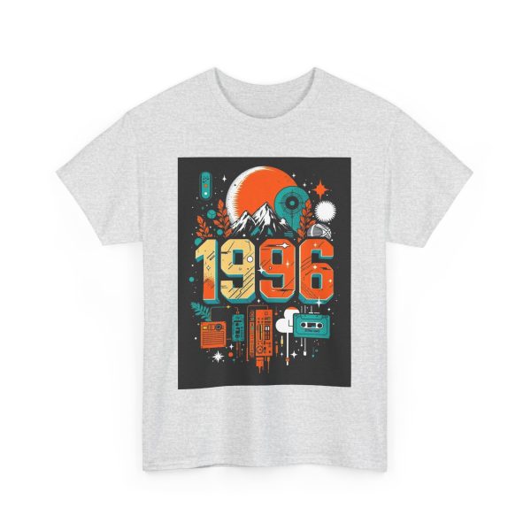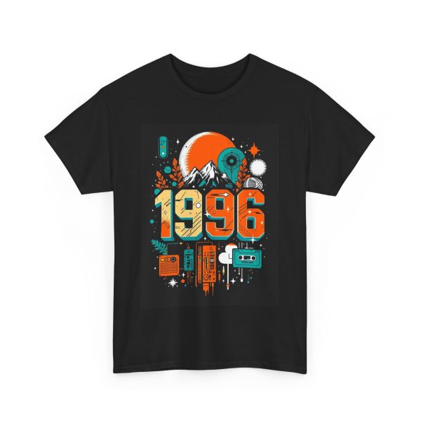 This vibrant retro-style illustration celebrates the year 1996 with a nostalgic blend of technology and nature. The large, stylized “1996” dominates the image, surrounded by iconic 90s gadgets like cassette tapes, a Walkman, and early gaming controllers. Above the numbers, a dramatic mountain landscape is set against a bold orange moon and starry sky, creating…